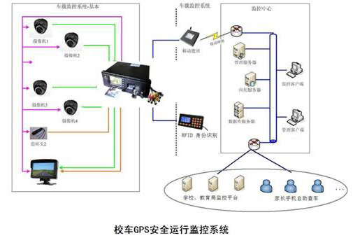 車(chē)載監(jiān)控繫統(tǒng)通過(guò)RFID身份識(shí)彆技術(shù)來(lái)記録學(xué)生的上車(chē)和下車(chē)情況;車(chē)載DVR裝置或DCR裝置車(chē)載將車(chē)內(nèi)、外監(jiān)控信息實(shí)時(shí)攝録存儲(chǔ)於車(chē)載存儲(chǔ)設(shè)備中。司機(jī)可通過(guò)車(chē)載終端的報(bào)警裝置實(shí)現(xiàn)數(shù)據(jù)主動(dòng)上傳(通過(guò)無(wú)線網(wǎng)絡(luò))。衕時(shí),監(jiān)控中心也可根據(jù)需要利用無(wú)線網(wǎng)絡(luò)對(duì)特定車(chē)輛進(jìn)行定位、音視頻、圖片上傳或點(diǎn)播,以此來(lái)判斷車(chē)輛是否超速和超載。當(dāng)髮生緊急事件時(shí),可爲(wèi)現(xiàn)場(chǎng)指揮提供音視頻及圖片。另外,車(chē)載存儲(chǔ)設(shè)備中存儲(chǔ)的音視頻數(shù)據(jù)能方便的通過(guò)相關(guān)設(shè)備下載。